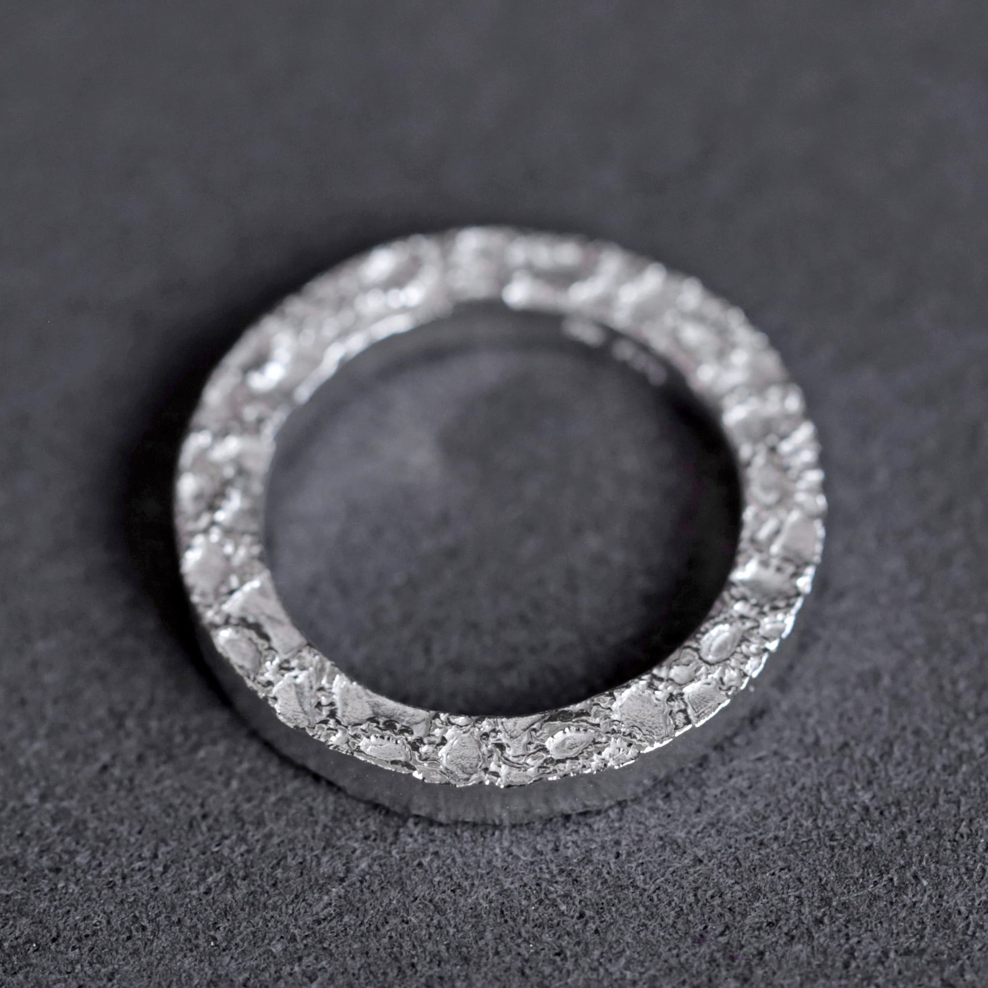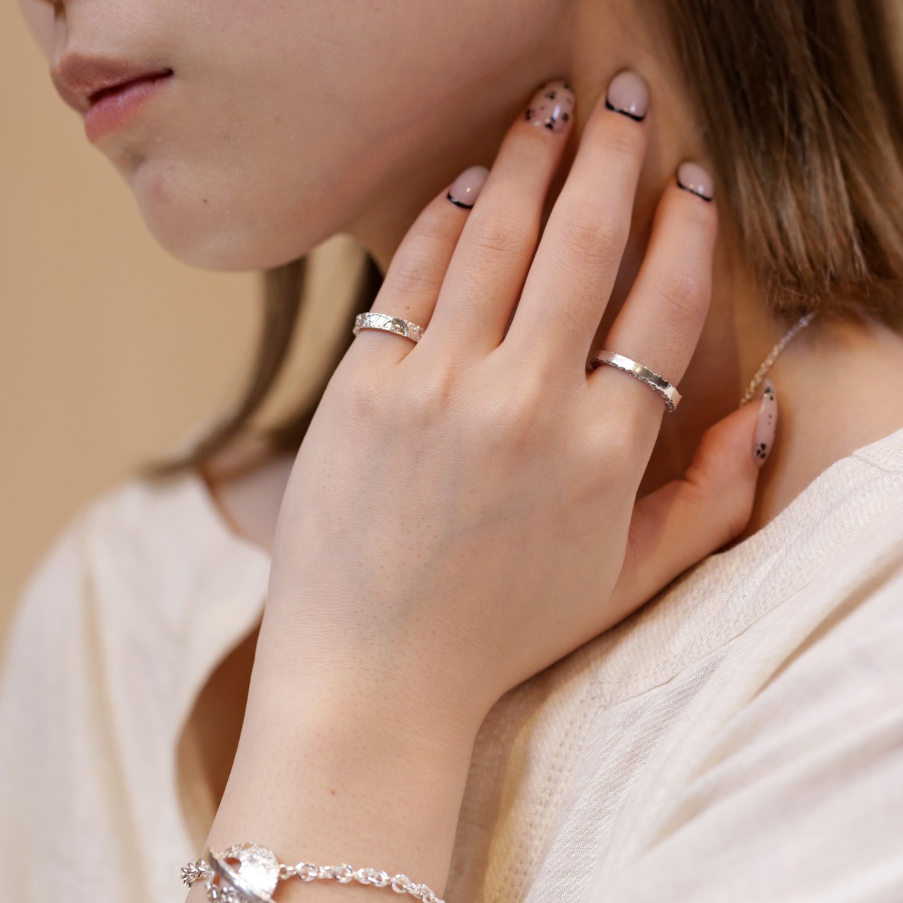 着けたときに正面は美しく磨かれた面、側面はレース模様のシンプルだけど遊び心のあるリング。